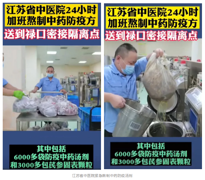江苏省中医院也在紧锣密鼓地加班熬制中药防疫汤剂,24小时不间断,并送到禄口密接隔离点。
