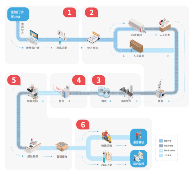 智慧共享中药房,是运用计算机控制、物联网及互联网技术,以煎药、包装设备为中心,将煎药工艺流程(包括处方管理、调剂、浸泡、物料传输、煎药、包装、物流配送)、终端客户服务、设备和人员管理、煎药工艺质量控制等环节进行全过程控制与管理的创新煎药服务模式。