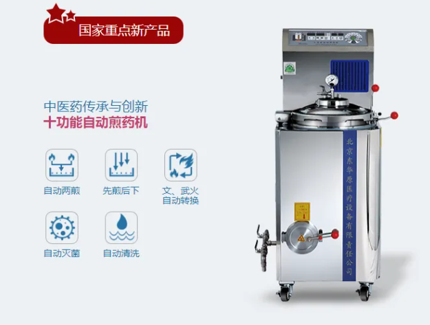 十功能自动煎药机,是东华原于2008年,承接国家中医药管理局及知名中医药专家的联合委托,研制开发的符合中医药传统的新型中药煎药机,具备先煎后下、自动两煎、文武火转换、自动循环、自动挤压等十余项功能。是国家中医药管理局首批推荐的中医诊疗设备,先后荣获国家重点新产品、中国好技术、北京市新技术新产品(服务)等多项殊荣,也成为了各中医医院、综合医院、代煎中心、中医门诊等中药煎药服务单位的最佳选择。