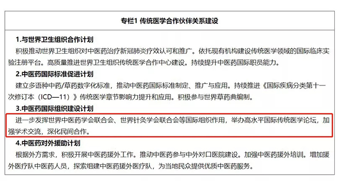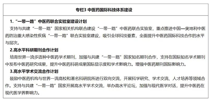 《规划》提出,深化全球卫生治理合作,着力构建传统医学合作伙伴关系。推动中医药纳入更多国家主流卫生体系和政府间合作机制,加大中医药对外援助力度。深化国际组织框架下合作,完善中医药国际标准化体系建设,协调制定国际传统医药标准和监管规则。深化医疗卫生合作,着力增加优质中医药服务供给。加强国际抗疫合作,完善中医药应对国际关注的公共卫生紧急事件机制,加大“三药三方”等有效方剂宣传和推介力度。打造高水平医疗服务平台,向共建“一带一路”国家民众、海外华侨华人、留学生、中资机构人员和赴境外旅行人员等提供优质中医药服务。
