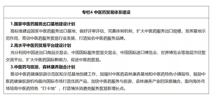 《规划》要求,深化国际贸易合作,着力培育中医药发展新优势。扩大中药类产品贸易,加快培育我国中医药国际化企业和国际知名品牌。做大做强中医药服务贸易,加强国家中医药服务出口基地建设,完善中医药服务贸易统计体系。扩大中医药国际市场准入,加强中药类产品海外注册服务平台建设,完善中药类产品当地销售和生产体系。深化健康产业合作,着力扩大中医药发展规模。提升企业“走出去”水平,加快培育产业链条完备的跨国公司和知名国际品牌。推动中外合作产业园建设,推动建立中外合作产业园中国注册中成药认可制度。加强中药材产业合作,提升产业数字化水平。深化区域国际合作,着力推进中医药开放发展。加强与区域战略协同对接。更好发挥各类开放平台作用,在中医药治未病纳入收费项目、中医药知识产权保护、进出口通关及检验便利化方面开展先行先试。