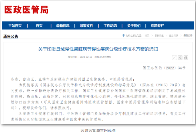 近日,国家卫生健康委办公厅、国家中医药管理局印发《县域高血压分级诊疗技术方案》(以下简称方案),为各县域医疗机构更好的落实自身功能定位,为高血压患者提供一体化、高质量的医疗服务,改善患者生存质量、有效降低国家和患者的疾病负担提供助力。