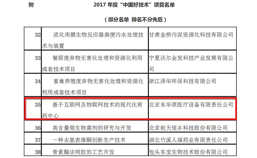 2018年5月11日中国生产力促进中心协会公布了2017年度“中国好技术”评审结果。其中北京九游j9官方网站设备有限责任公司的《基于互联网及物联网技术的现代化煎药中心》入围2017年度 “中国好技术”奖项。
