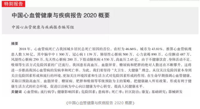 《中国心血管健康与疾病报告2020》推算心血管病现患人数3.30亿。其中高血压2.45亿,下肢动脉疾病4530万,脑卒中1300万,冠心病1139万,肺原性心脏病500万,心力衰竭890万,心房颤动487万,风湿性心脏病250万,先天性心脏病200万。由于不健康饮食、身体活动不足、吸烟等生活方式危险因素的广泛流行,我国患有高血压、血脂异常、糖尿病和肥胖的绝对人数还在不断攀升。