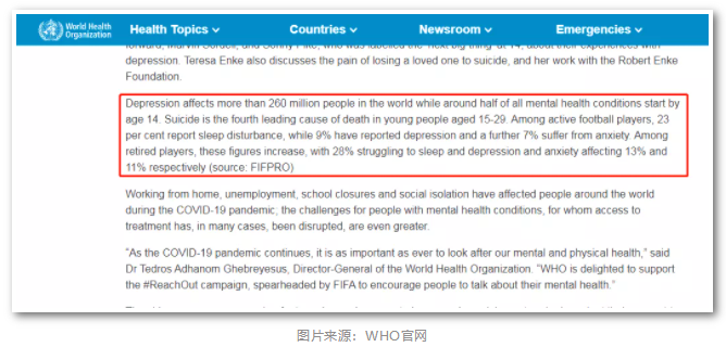 据有关统计报告,当前学生群体抑郁症发病率高达23.8%。此前,WHO在2014年的《世界青少年健康报告》中指出:2012年全球有大约130万青少年死亡,15〜19岁为高风险阶段;自杀是全球青少年死亡的第三大原因;抑郁症是残疾的最重要原因。该报告还指出,一半的成年人精神心理疾患开始于14岁,然而大多数问题没有得到识别诊治,对一生精神健康产生重要影响。