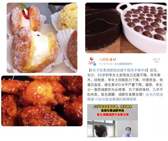 但在这焦虑之下,仿佛有“两幅面孔”。一方面,减肥不知从什么时候起,成了各年龄段的“必修课”。前几日,一则减肥新闻登上热门。长沙一名23岁女子为了减肥,长期不吃肉类,导致四肢肌力下降,中度贫血、低蛋白症,在症状上表现为走路不稳,双手麻木。另一方面,与减肥相对的,网络上充斥的各种吃播、美食视频以及走红的各种“拉丝”“爆浆”“油炸”的网红美食、高热量食品,与久坐不动的习惯交织在一起,不断催生出愈加圆润的身体。
