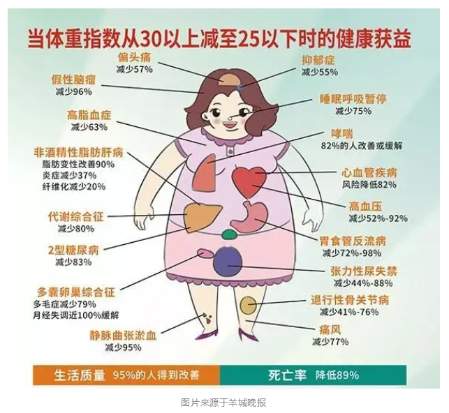 我们在日常的一些健康科普中,经常看到肥胖群体存在的健康隐患,却很少显而易见地看到减重所直接带来的健康好处。当身体质量指数从30以上减至25以下时,到底会发生什么?