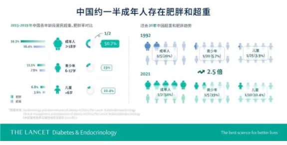 随着生活水平的不断提高,肥胖已成为影响人类健康的慢性代谢性疾病。此前,华中科技大学同济医学院公共卫生学院潘安等在《柳叶刀·糖尿病与内分泌学》6月刊上发表了关于中国肥胖的系列文章。文章指出,《中国居民营养与慢性病状况报告(2020年)》最新数据显示,我国超过1/2的成年人超重或肥胖,超重和肥胖率分别为34.3%和16.4%。6岁以下儿童中,1/10超重或肥胖,超重和肥胖率分别为6.8%和3.6%;6—17岁青少年中,近1/5超重或肥胖,超重和肥胖率分别为11.1%和7.9%。