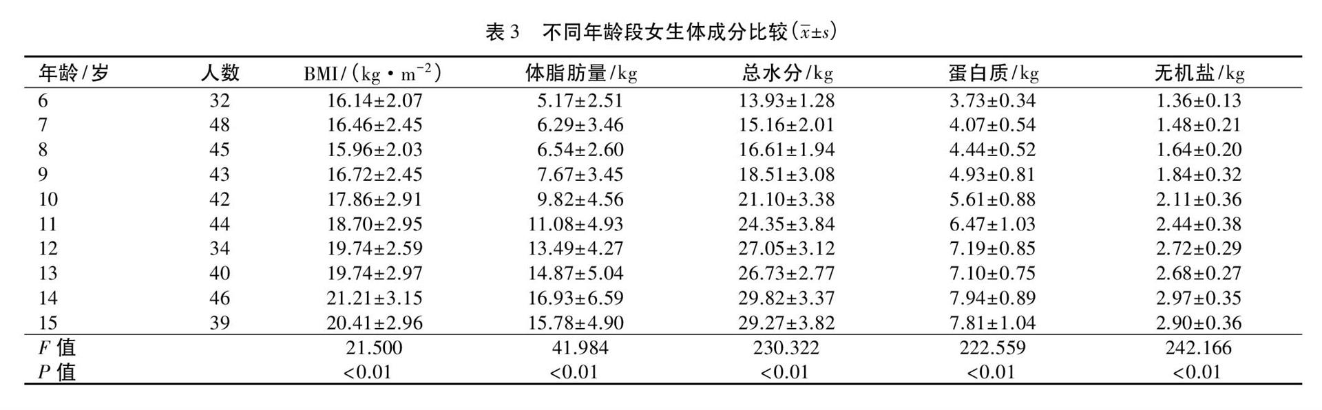 2.2 不同年龄段儿童青少年体成分比较 见表 2~3。