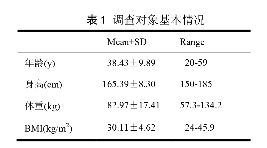 1.1 对象 2013 年 11 月 9 日至 2014 年 1 月 25 日间,在知情同意的基础上,招募 BMI≥24,年龄 20~60 岁的成年人共 148 人,其中男性 61 人,女性 87 人,如表 1 所示,平均年龄为38.43±9.89 岁,平均身高为 165.39±8.30cm,平均体重为 82.97±17.41kg,平均 BMI 为 30.11±4.62,按中国成人超重和肥胖症预防控制指南中 [6] 的肥胖、超重范围进行分组,24≤BMI<28 为超重,BMI≥28 为肥胖。经询问病史,排除各种重要脏器病史(如心血管疾病、肺炎、肝炎、胃炎、肾炎等)、身体发育缺陷、代谢性疾病等,所有受试者分别同时采用 BIA和 DXA 测定人体成分。