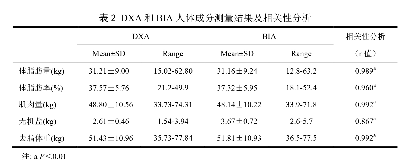 目前测量人体成分的方法有很多,常用的有水下称重法、皮褶厚度法、计算机断层扫描法(CT)、DXA 及 BIA 等 [7] 。其中可以作为人体成分测量金标准的有水下称重法、计算机断层扫描法(CT)和 DXA -2 。而由于操作难度、使用费用的问题,DXA 较其余两种金标准而言更为常用,且具有扫描时间短、精度高、辐射量低等特点,常作为标准来评价其他体成分测量方法 [11,12] 。所以我们也选取 DXA 作为人体成分测量的金标准来验证 BIA 测量的准确性。