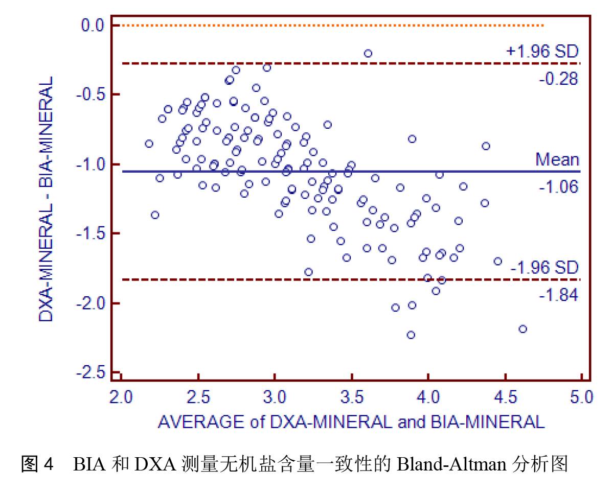 对 BIA 和 DXA 测量人体无机盐含量的一致性进行 Bland-Altman 分析,如图 4 所示,从图中可以看出,148 个点中有 7 个位于一致性界限范围以外,比例为 4.73%,小于 5%。在一致性界限范围内,BIA 与 DXA 测量结果差值的绝对值最大为 1.81,两种方法测量结果的平均值为 3.99,这种相差的幅度在临床上不可以接受,因此认为两种方法测量无机盐含量一致性较差。从图上可以看出,DXA 与 BIA 人体成分分析仪测量的差值都为负数,因此,与 DXA 相比,BIA 的测量结果高估了无机盐的含量。另外还可以看出,随着 BIA 和 DXA 测量平均值的增大,DXA 与 BIA 差值的绝对值也逐渐增大。