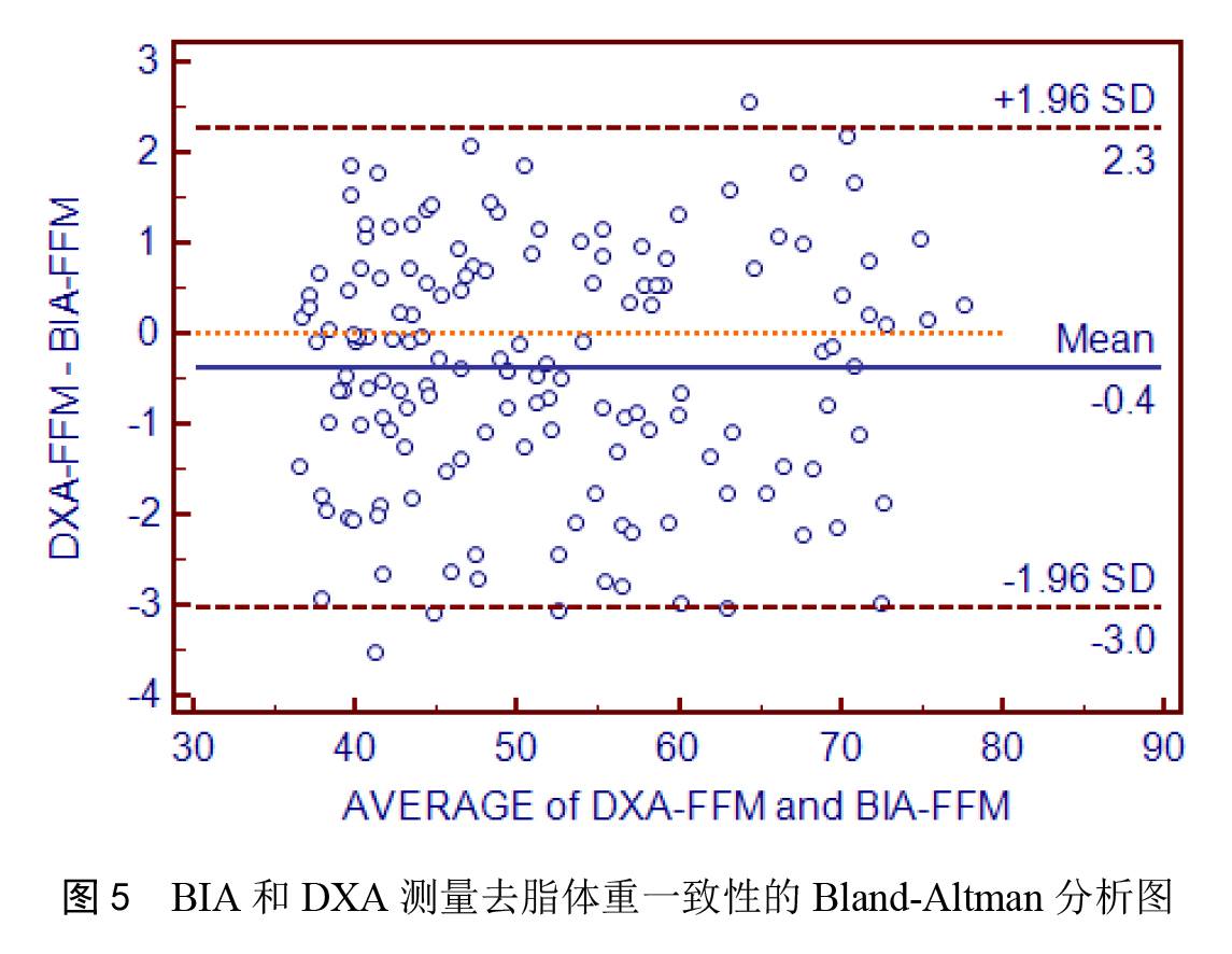 对 BIA 和 DXA 测量人体去脂体重的一致性进行 Bland-Altman 分析,如图 5 所示,从图中可以看出,148 个点中有 5 个位于一致性界限范围以外,比例为 3.38%,小于 5%。在一致性界限范围内,BIA 与 DXA 测量结果差值的绝对值最大为 2.99,两种方法测量结果的平均值为 60.11,这种相差的幅度在临床上可以接受,因此可以认为两种方法测量的结果具有较好的一致性,两种人体成分分析仪方法在临床上测量脂肪率时可以互相代替使用。