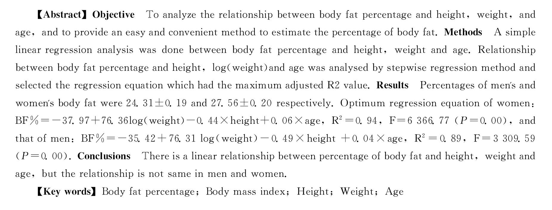 【关键词】体脂肪率;人体质量指数;身高;体质量;年龄