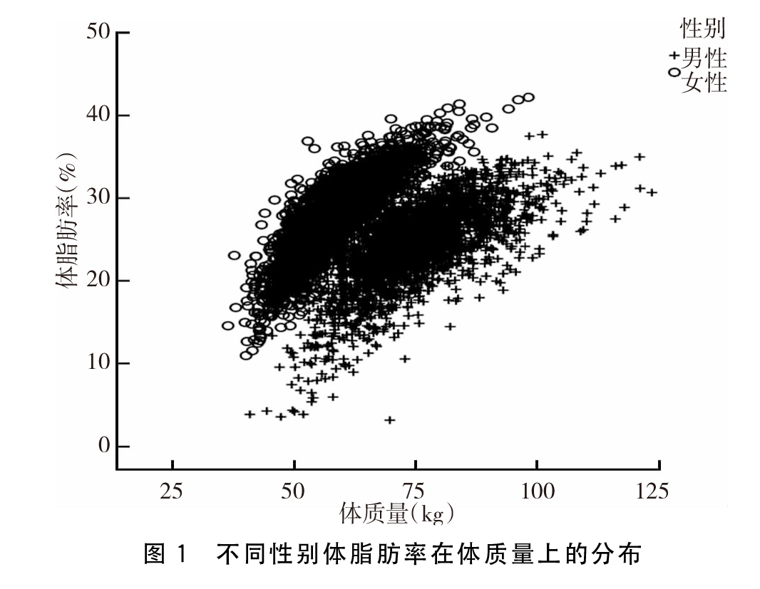 男性与女性的体脂肪率分别为(24.31±0.19)%和(27.56±0.20)%,差异有统计学意义(t=23.58,P<0.01)。在相同体质量的情况下,女性的体脂肪率略高于男性,差异有统计学意义(P<0.05)。见图1。
