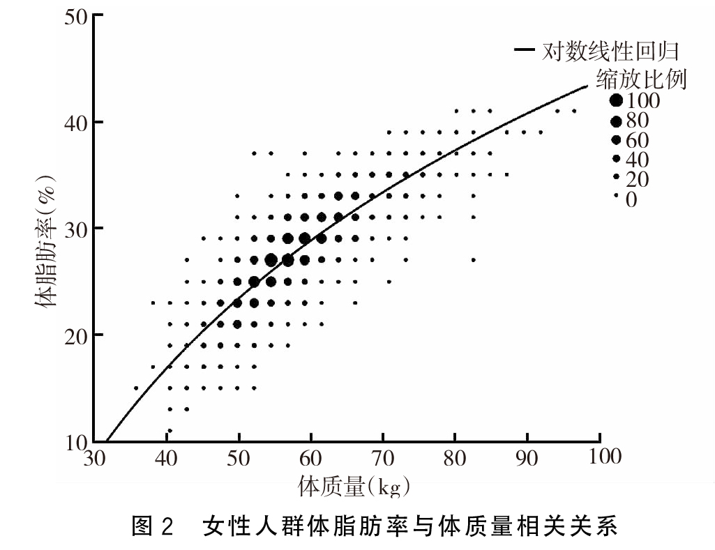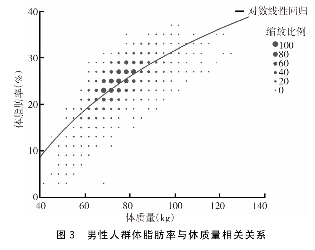 本次调查结果显示,体脂肪率与身高、体质量以及年龄之间存在线性关系。并且,不同性别其线性关系也不尽相同。体脂肪率与身高、体质量以及年龄之间的关系:与BMI相同,体脂肪率与身高存在着负相关的关系,而与体质量存在着正相关的关系。但是,与BMI不同的是体脂肪率与体质量之间的关系为对数线性关系。研究显示,体脂肪率与年龄之间也存在着正相关关系,即在同等的条件下,年龄越大则体脂肪率可能越大,但是与身高体质量相比,其影响相对比较小。