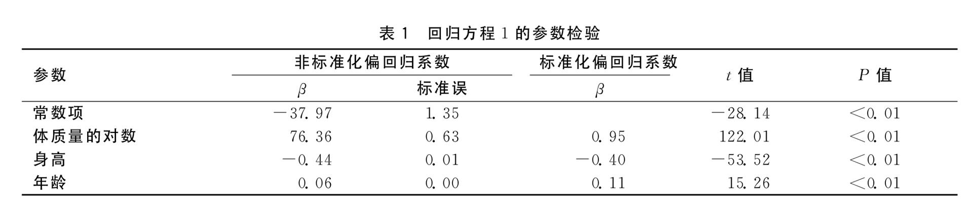 最优回归方程1:体脂肪率=-37.97+76.36log(体质量)-0.44×身高+0.06×年龄,R2为0.94,F=6 366.77(P<0.01),以α=0.05为检验水准,回归方程及其参数均有统计学意义。见表1。