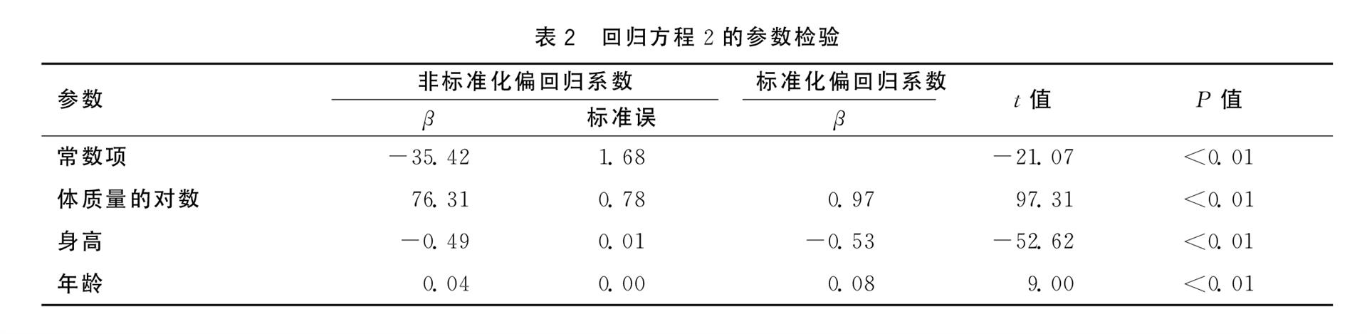 3。多重回归分析获得男性人群回归方程:体脂肪率=-35.42+76.31log(体质量)-0.49×身高+0.04×年龄,其中R2=0.89,F=3309.59(P =0.00),以α=0.05为检验水准,回归方程及其参数均有统计学意义。见表2。
