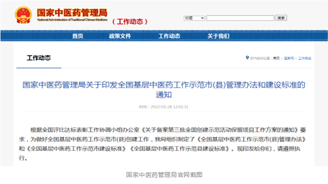 国家中医药管理局:全国基层中医药工作示范市(县)管理办法和建设标准印发