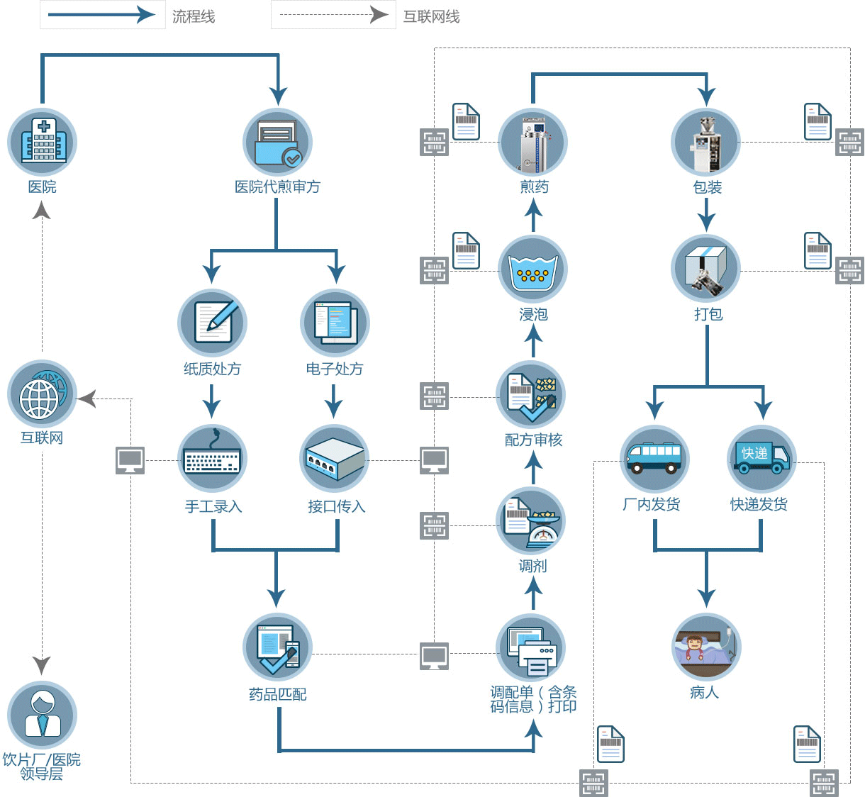 智慧中药房,是运用计算机控制、物联网及互联网技术,以煎药机、包装机设备为中心,将煎药工艺流程(包括处方管理、调剂、浸泡、物料传输、煎药、包装、物流配送)、终端客户服务及设备和人员管理、煎药工艺质量控制等环节进行全过程控制与管理的创新煎药服务模式。